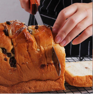 Fabricado con hoja de acero inoxidable de alta resistencia, cuenta con dientes tipo sierra que facilitan el rebanado preciso. Su mango de madera ofrece un agarre firme y cómodo, pensado para durar y trabajar con seguridad.