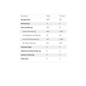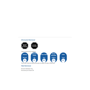 Manteca de palma, mezcla de aceites vegetales (canola, soya, maravilla), mezcla de aceites vegetales interesterificados (semilla de palma y soya), oleína de manteca de palma, aceite de soya y canola completamente hidrogenados, BHT y saborizante idéntico a natural.