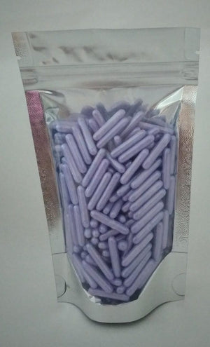 Agrega un toque elegante y moderno a tus decoraciones con estos sprinkles tipo rods color púrpura metálico.